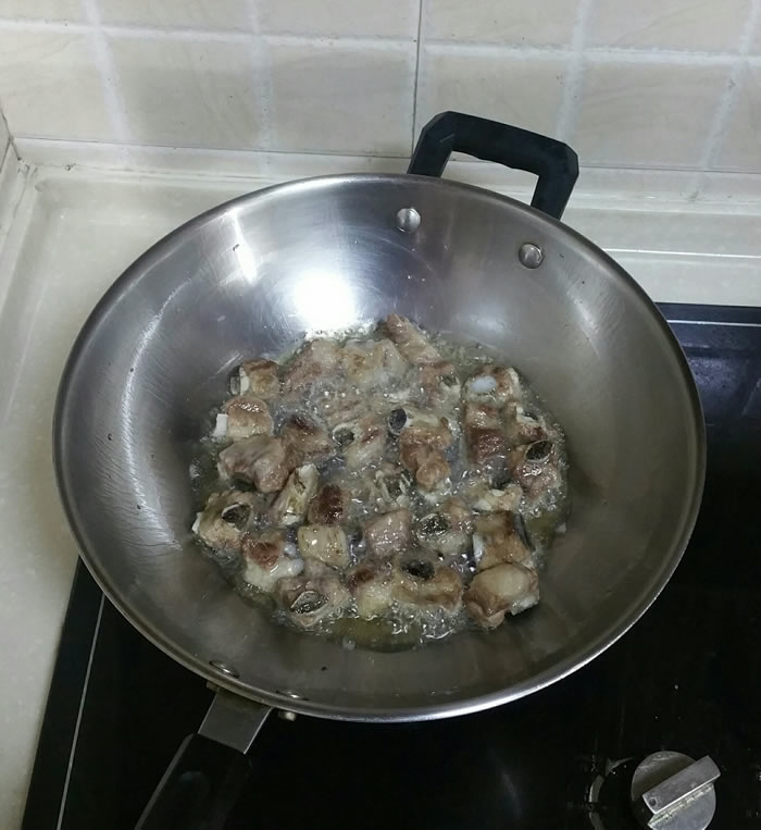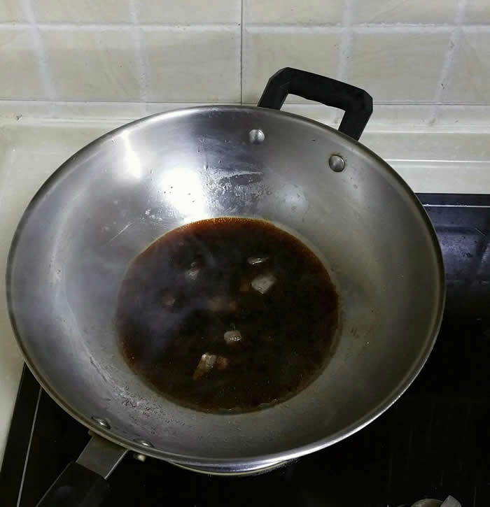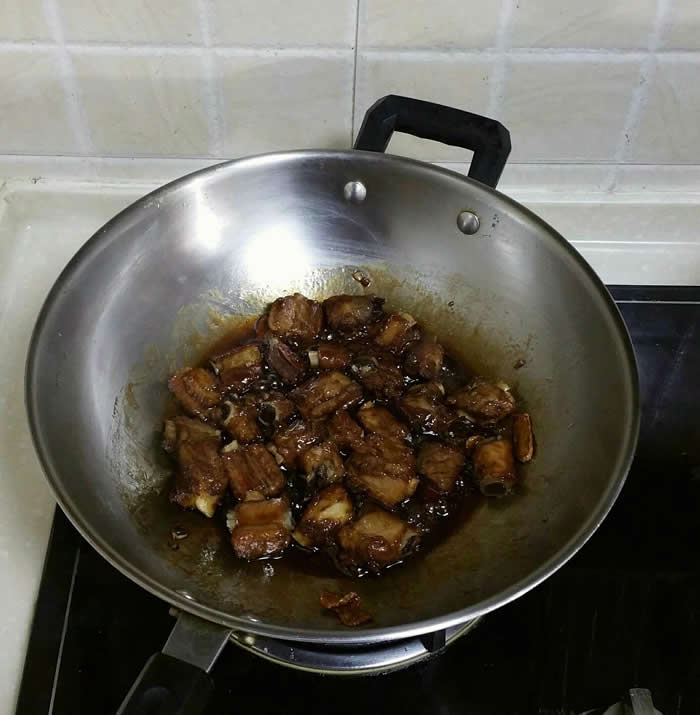 冰糖是块状,用刀背拍碎,很快就煮化。糖醋排骨之前加老抽上色,但颜色偏深,之后换成红酱油或一般酱油颜色就没那么深。