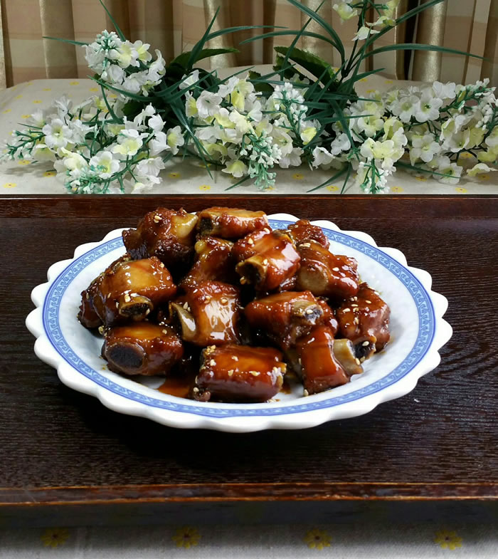 8下入排骨,小火煮15分钟左右收浓酱汁,关火,撒上芝麻即可