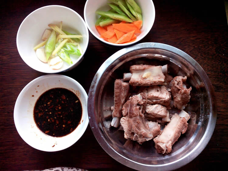 1准备食材:排骨提前用高压锅压熟,调料汁(酱油、糖、醋、盐)准备好