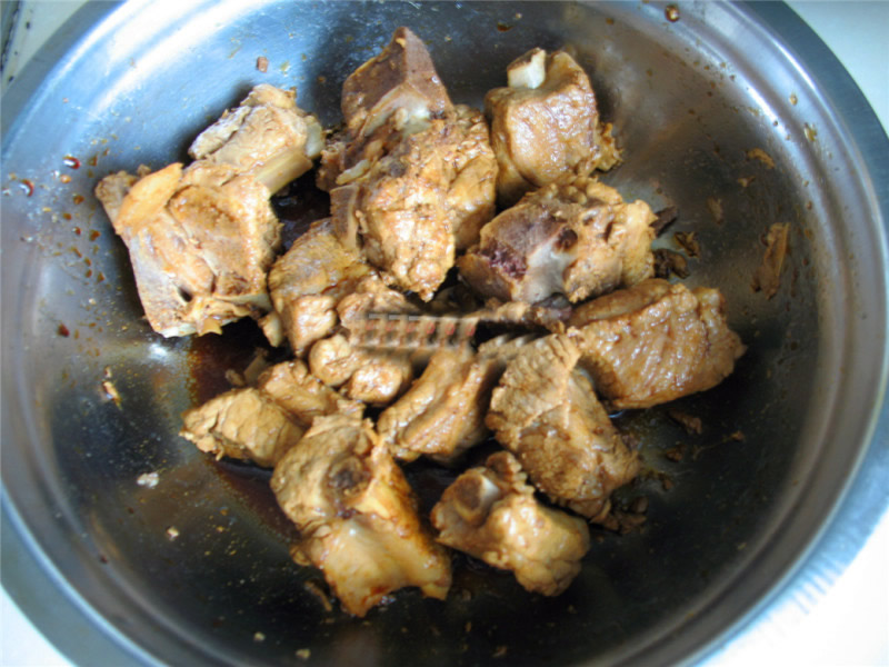 6将多余油倒出,锅内留少许油,加入3汤匙白糖、少量肉汤,一点点盐(腌制时候已经加了盐,不要加多)加入排骨中小火煮5分钟。