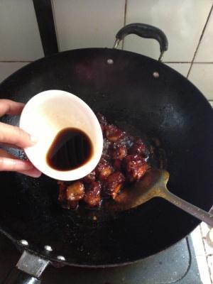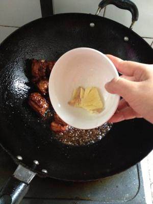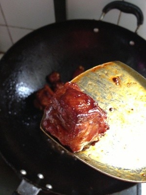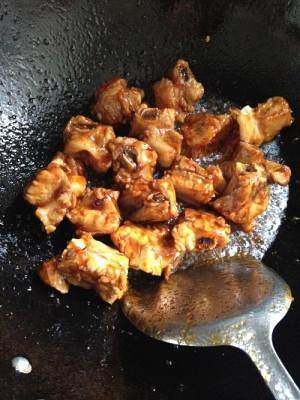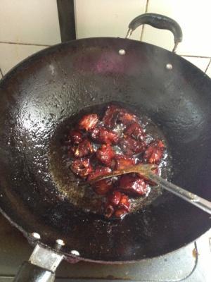10关火后马上倒入排骨,快速翻炒,让糖色均匀的裹在排骨上(这个步骤关火,能避免糖色在最后阶段产生焦糊,而且油温已经很高,尽量减少飞溅的油点子)