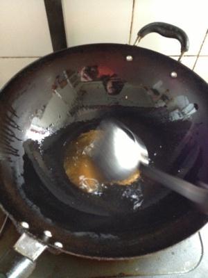 5冷油把冰糖放入,转为中火。趁着油温把冰糖再压碎一些