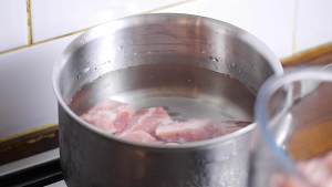 3在一锅冷水中放入2片姜,倒入排骨,大火烧开后捞出排骨沥干待用