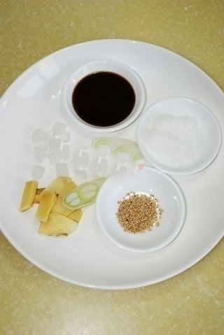 2副料:葱、姜、白芝麻调料:冰糖、香醋、盐、白糖、料酒