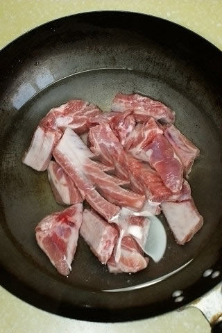 3排骨洗净后凉水下锅焯烫,水中加少许盐、料酒去腥