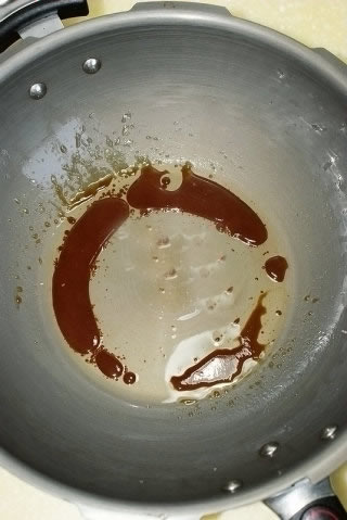 5锅中做油,加冰糖小火炒制,用勺子快速搅拌