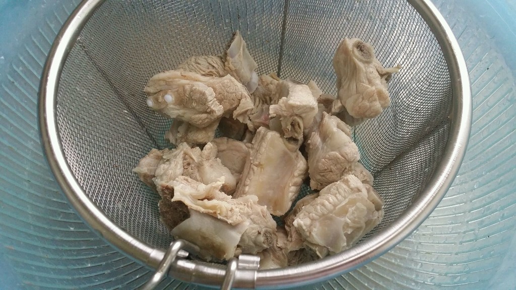 2关火,把肋排倒入网篮中,沥掉脏水,再用干净的温水把浮沫冲洗掉。