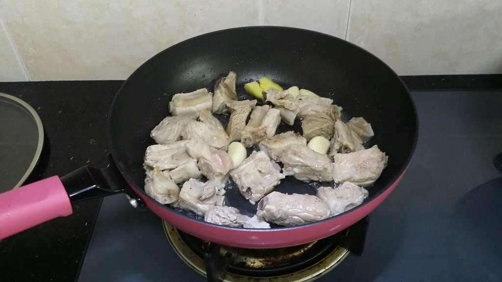 3把锅洗干净,烧热后倒入适量色拉油,烧至八成热。再把排骨,生姜,大蒜倒入一起翻炒。