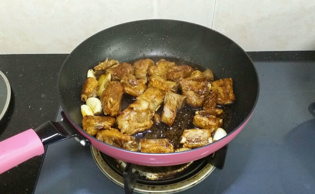 5排骨上色后,把冰糖放入。把开水沿着锅的边沿慢慢倒入,刚好没过排骨即可。大火把水烧开,再转小火,盖好锅盖。