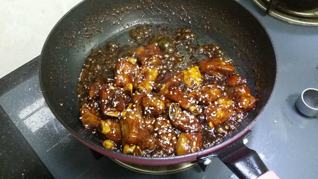 7收汁时要翻炒,避免粘锅。快要出锅前洒上芝麻,翻炒几下就可以华丽出锅啦。