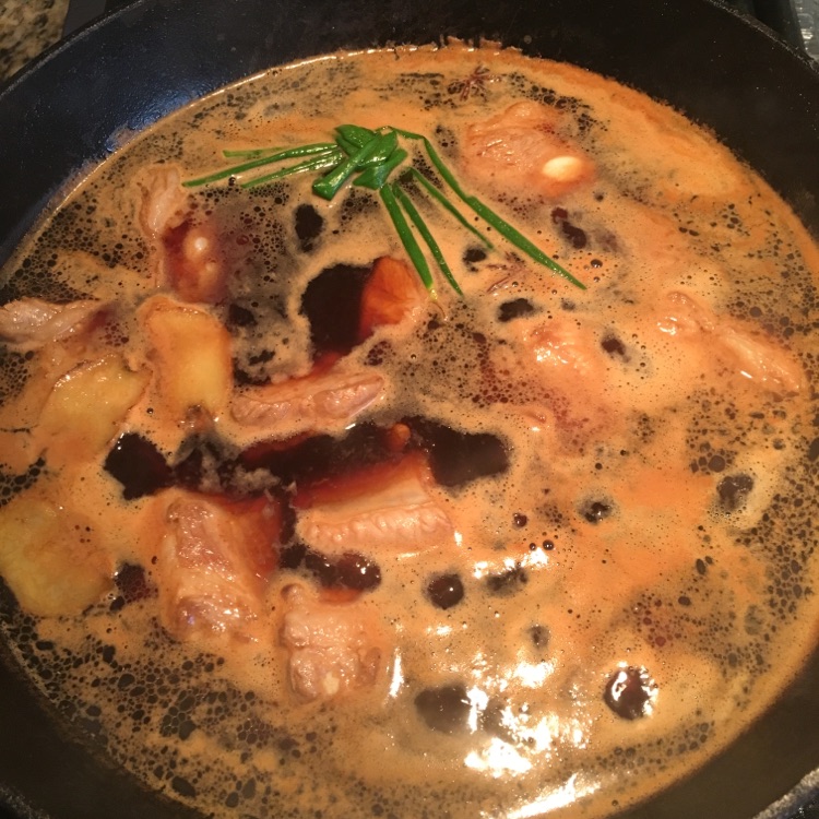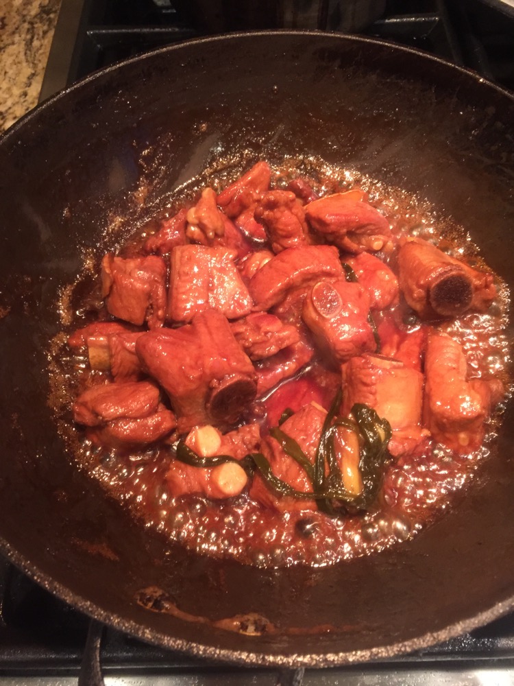 6小火焖煮至汤浓,余下一些汁,将排骨盛出。如果水余比较多可以大火收汁缩短时间。