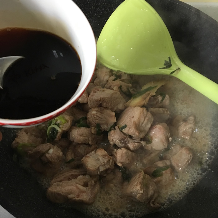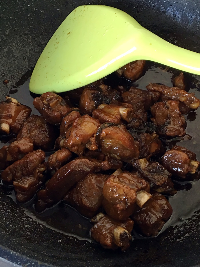 6 加入水,没过排骨,大火烧开,转小火炖二十五分钟,转大火收干