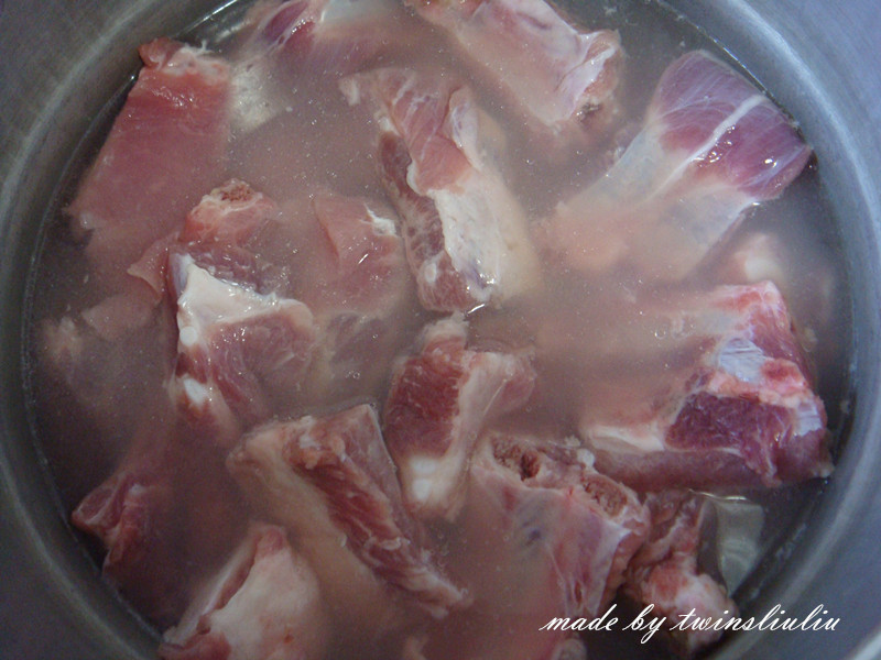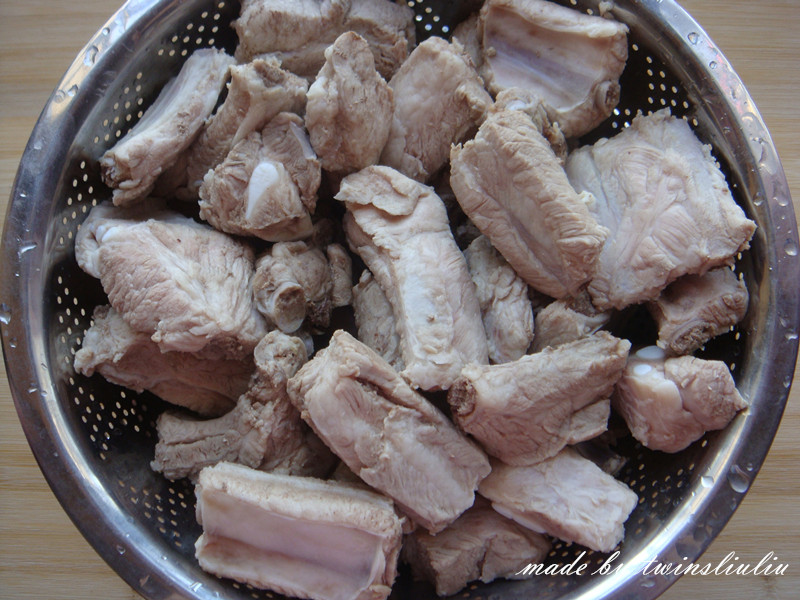 3将浸泡后的排骨进行焯水。焯水时凉水下锅,当排骨的颜色变白后,将其捞出。用温水将粘在排骨上面的血沫冲干净后控干水份备用。