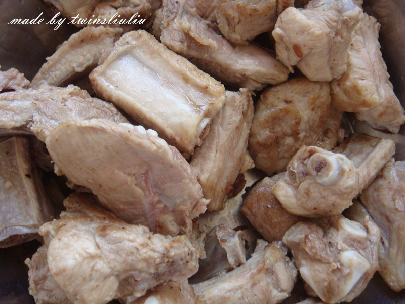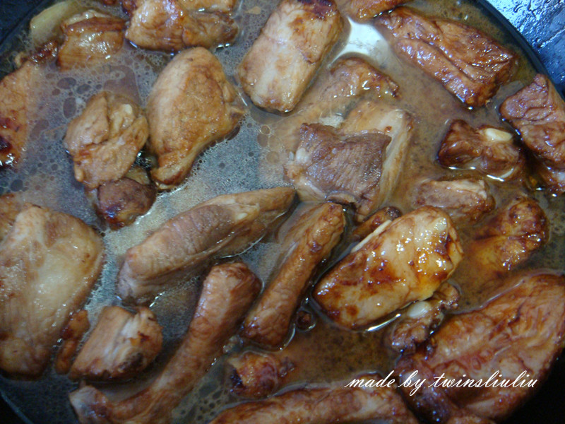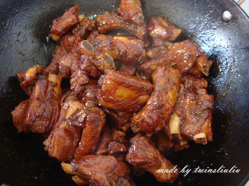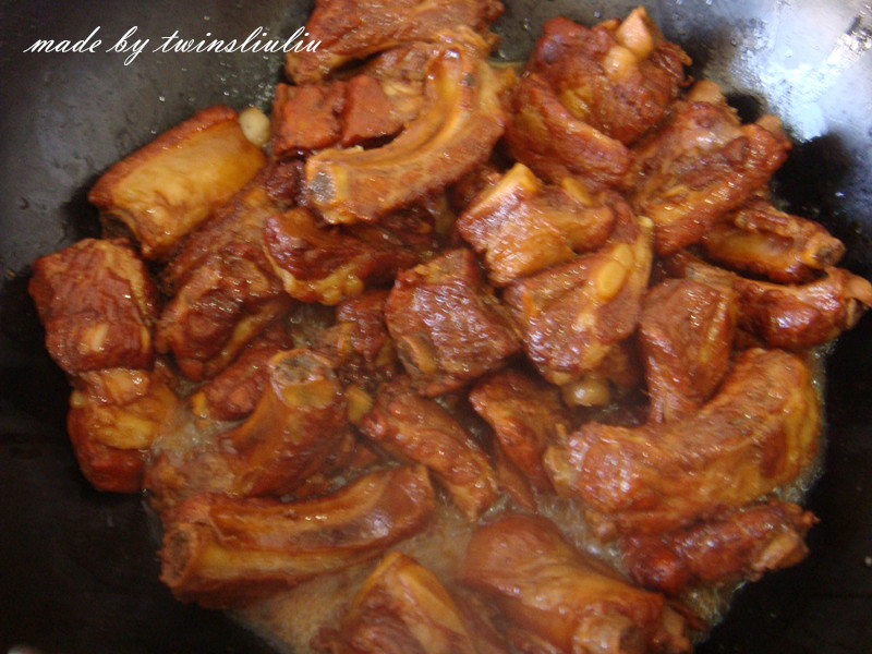 5当香料的香味儿散发出来,同时排骨表面出现金黄色的小壳时关火,盛出备用。