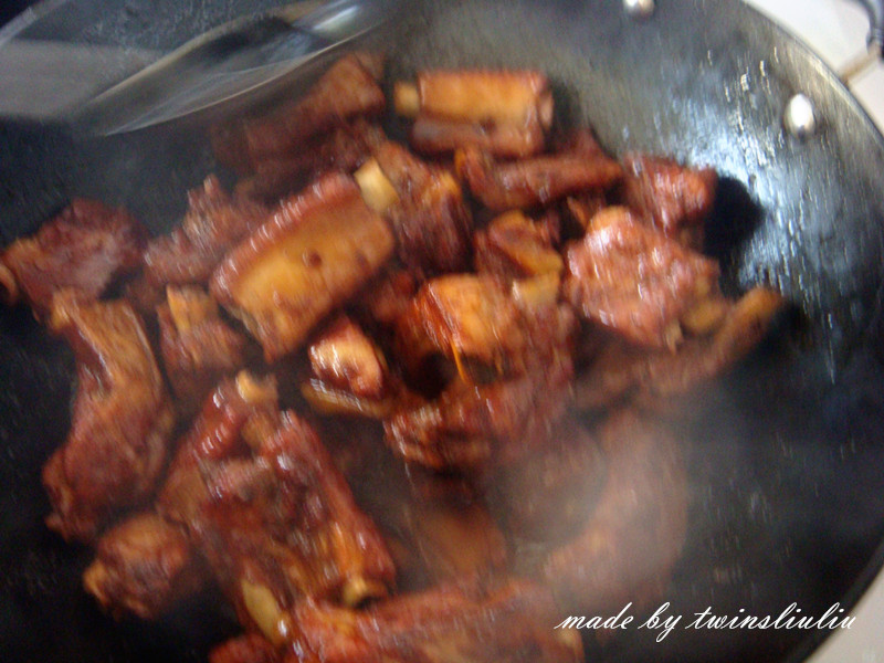 11 排骨制熟后,掀开锅盖,大火收汁。此时加盐,糖,翻炒均匀。