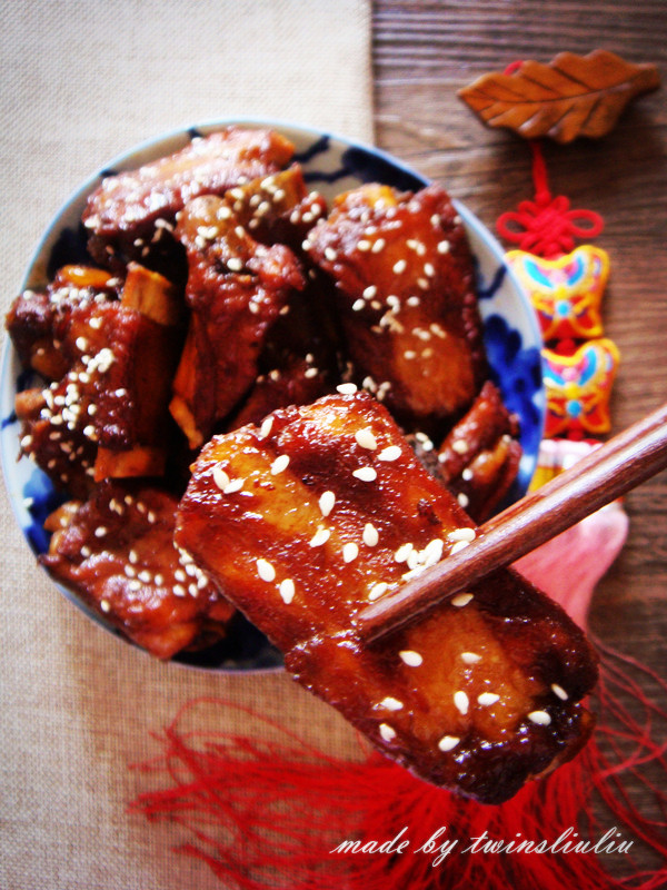 13翻炒至汤汁浓稠且均匀挂在排骨上,关火。撒上白芝麻装饰。