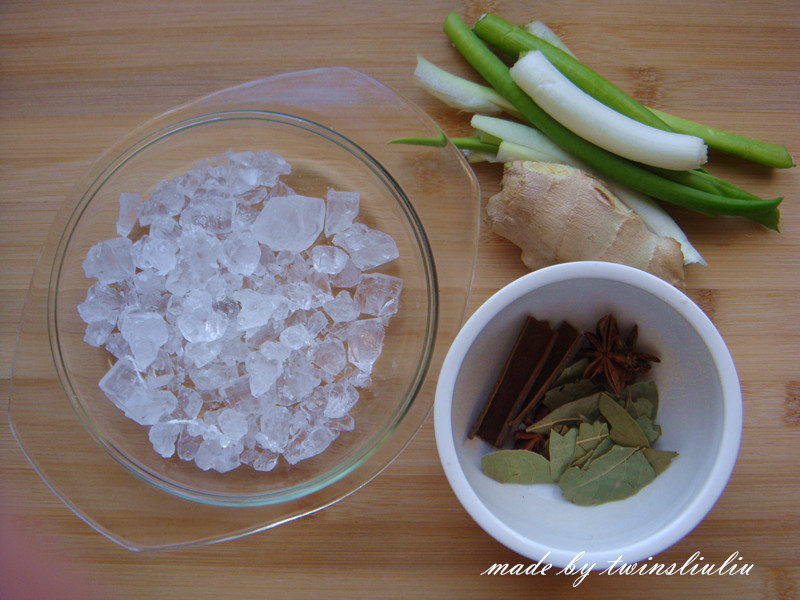 2 准备食材:葱:1根,姜:1块,八角:2朵,香叶:3片,桂皮:1段,冰糖:200克(包括炒糖色和炒制调味用的),盐:10克,料酒:半小碗,醋:1小碗,白芝麻:适量。口味根据您的喜好而定,经过测试,我觉得糖:醋:料酒的比例为3:2:1时口感最佳。