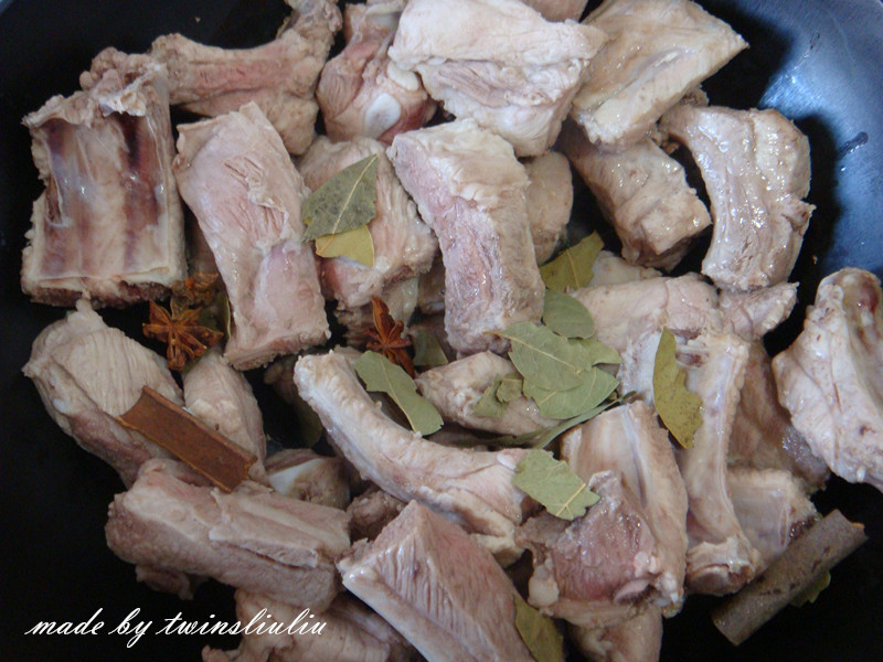 4锅中倒入底油,油热后将八角、香叶、桂皮、葱、姜与控干水份的排骨一起进行煸炒。这样作目的是将排骨多余的油脂煸炒出来,并且使香料的味道充分浸入排骨当中。这是使排骨香而不腻的关键。