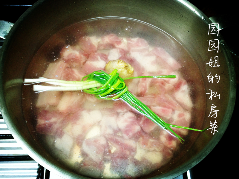 1 排骨斩成3里面左右大小洗净,放入深锅中加水淹过排骨再多出1/3,放入小葱,姜,和料酒。大火烧开后,转中小火煮30分钟。