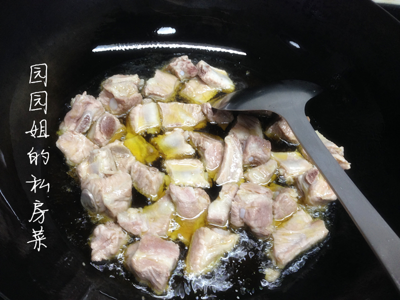 3起油锅当油温至6成热时倒入排骨用中火煸炒至上色,整个过程约2分钟。上色后捞起排骨,锅中留油,继续开大火烧至8成热时,再将排骨倒回锅中用大火煸炒40秒后捞起。