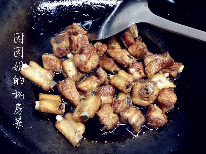 7然后淋入浇汁,转大火翻炒至每块排骨都裹上浇汁。然后关火。