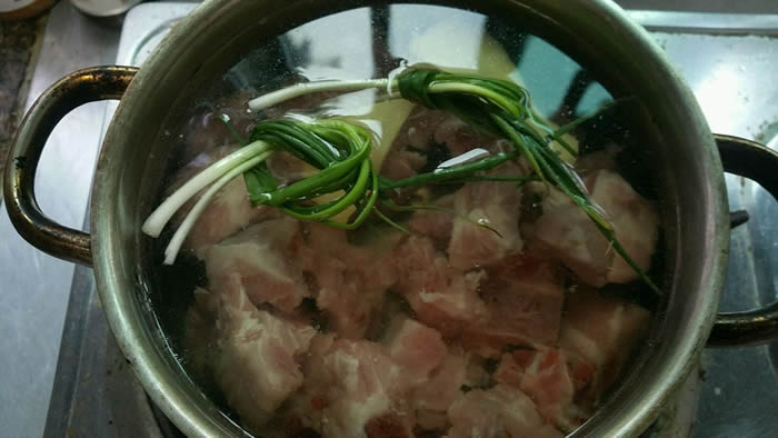 1排骨洗净入锅中,放适量水,加两片姜和葱结