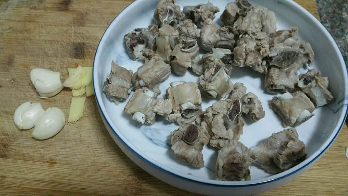 3捞出排骨,切适量姜片、蒜备用!胡萝卜排骨汤加适量盐,等孩子们放学回来喝