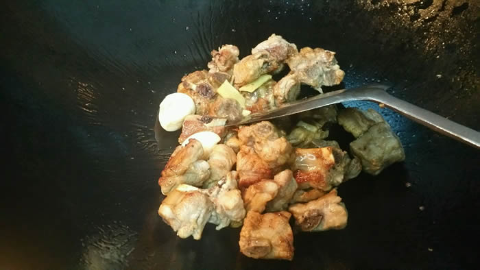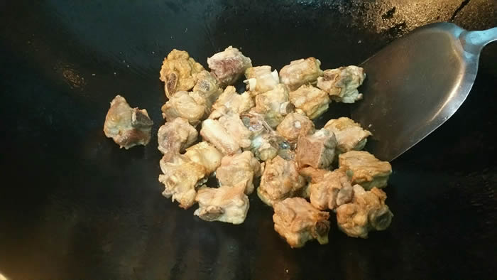 5锅内热油,放入排骨炒至金黄