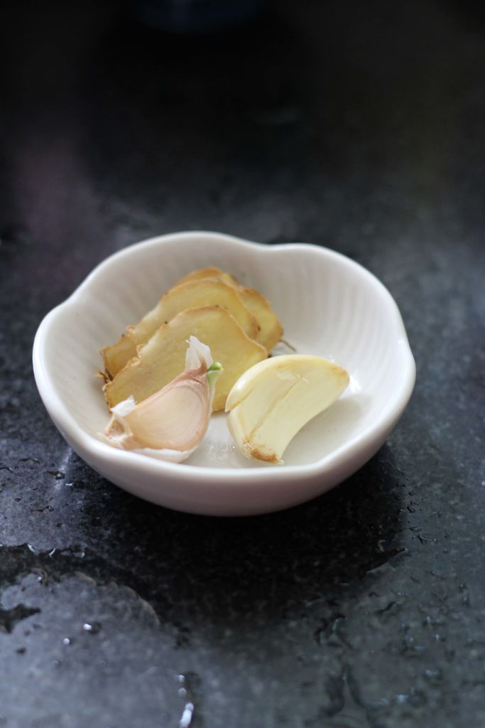 2生姜切片,大蒜去皮。