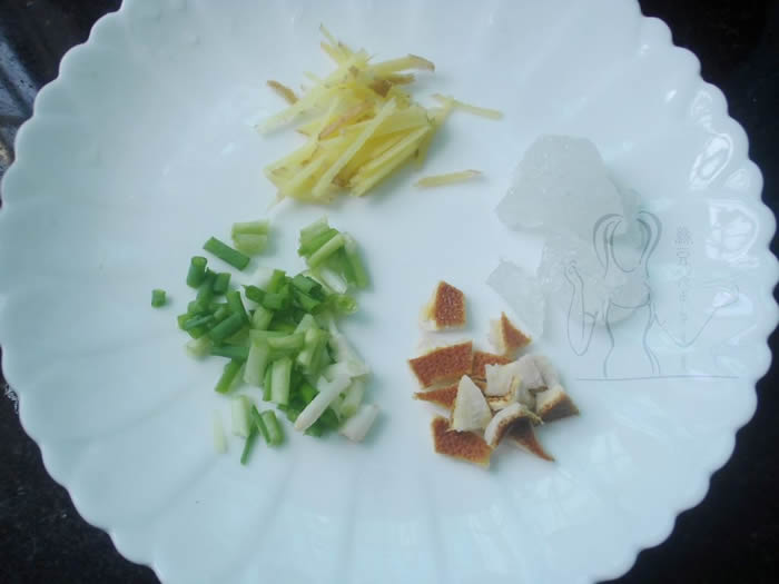 3葱切小段,姜切丝,陈皮掰成小块