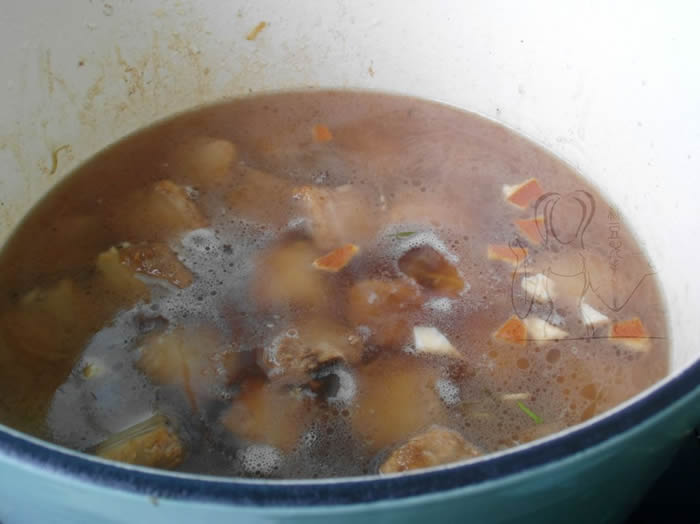 6接着倒入开水,刚没过排骨就可以,放入陈皮,烧开后转中小火,盖上锅盖烧40分钟左右