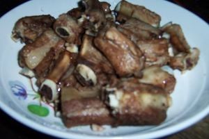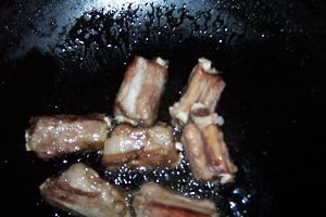 3锅中放入少许油,煎炸把控干的排骨。