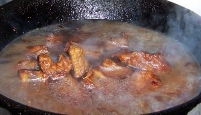 6放入炸好的小排,煸炒均匀 加入酱油 葱姜番茄酱和水