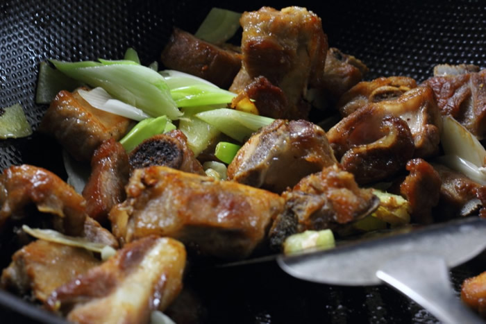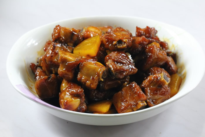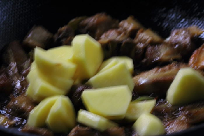 11小排快熟时放入土豆,再慢慢煨炖至熟。后再放入上面留出来的一小半糖醋汁倒入锅中,开大火收汁即可。