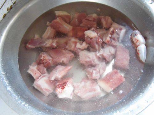 1排骨用清水浸泡半小时,泡出血水,捞出后冲洗干净。