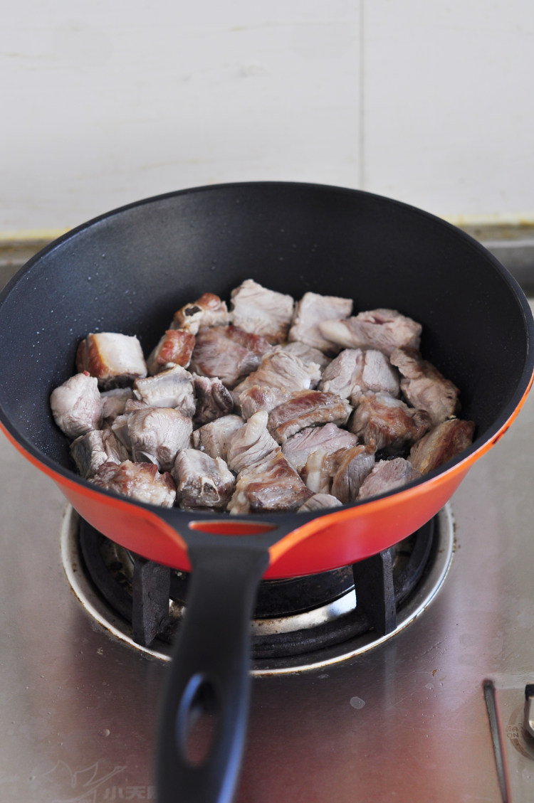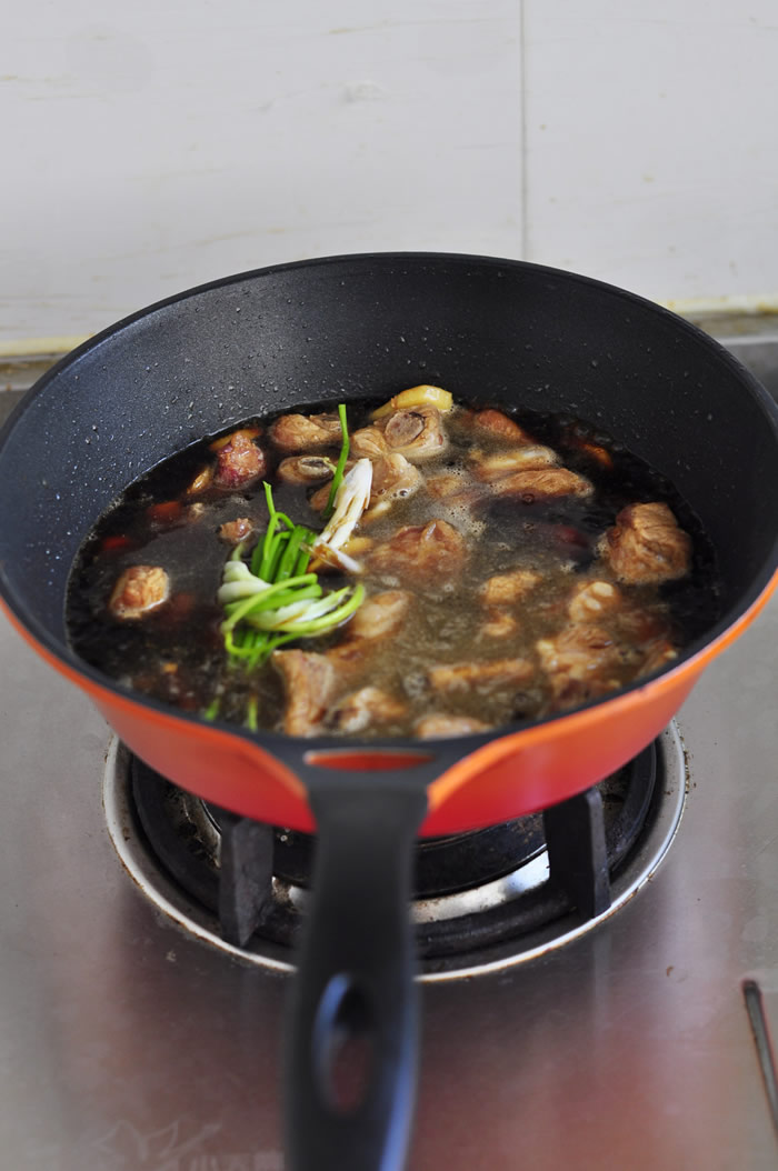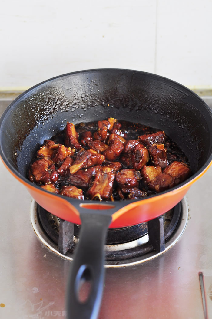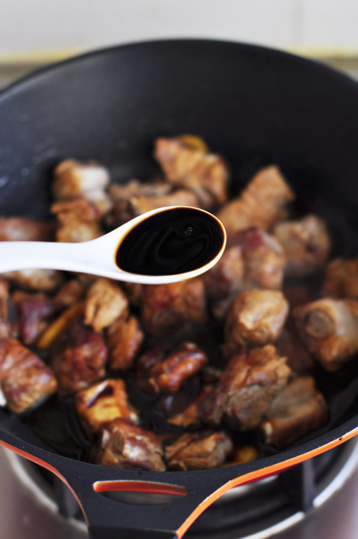 5加红烧酱油,五香粉,2汤匙香醋,煸炒片刻。