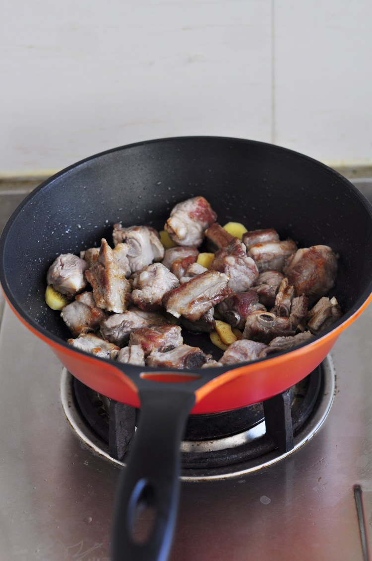 3锅里放油,把排骨中火煎金黄,翻面继续煎金黄。