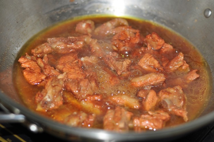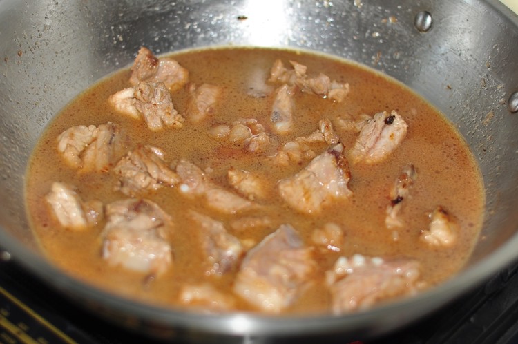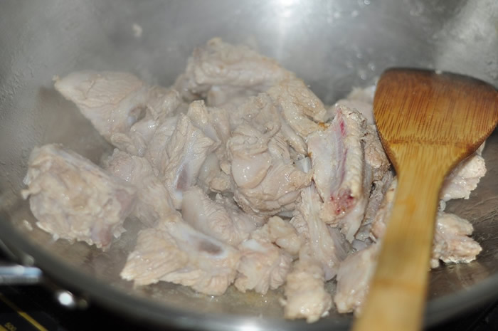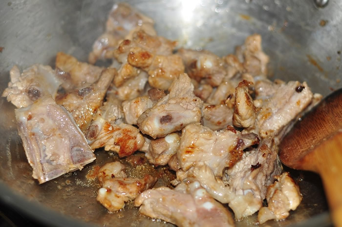 4将焯好的排骨倒入锅中加少许白糖煸炒片刻。
