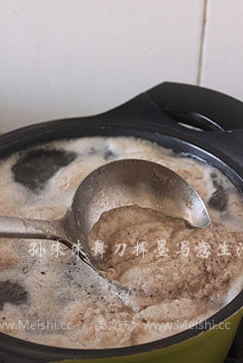 2将锅烧开,然后用勺子将上面的浮沫撇干净,可以用大火烧开浮沫都飘起来,这样很容易将浮沫撇的很干净