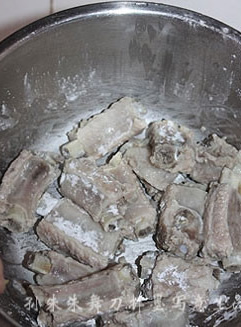 4捞出排骨控一下汤,放入盆中撒干淀粉,两手端着盆子上下颠翻,让排骨均匀的粘上薄薄一层干淀粉
