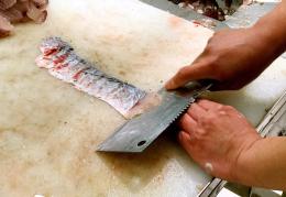2剁下鱼头从中间劈开,用刀从尾部片下两层鱼片,剁小块,鱼骨剁小块,洗净血水备用。(刀工实在不好,刀工好的小伙伴可以去骨切片更入味)