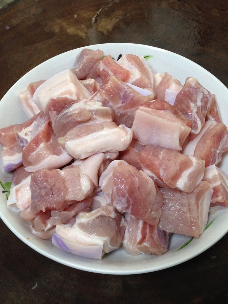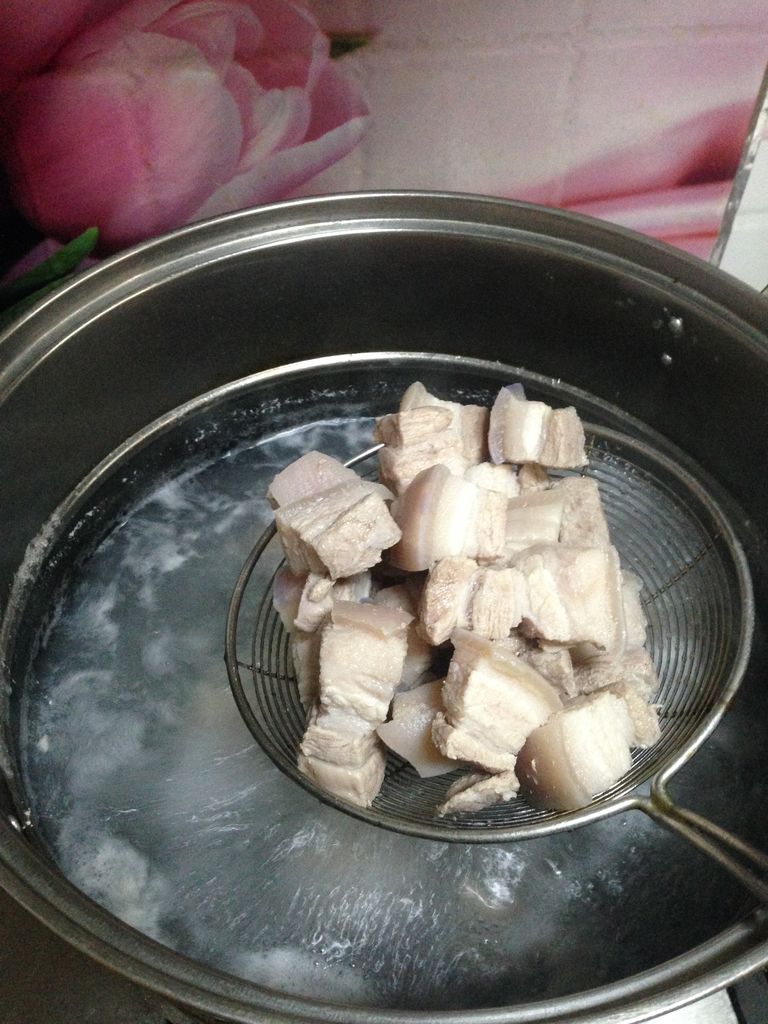 1五花肉洗净,浸泡5分钟,捞出冲净切成麻将牌大小的块(肉不要切得太小,以免后面制作时缩小)