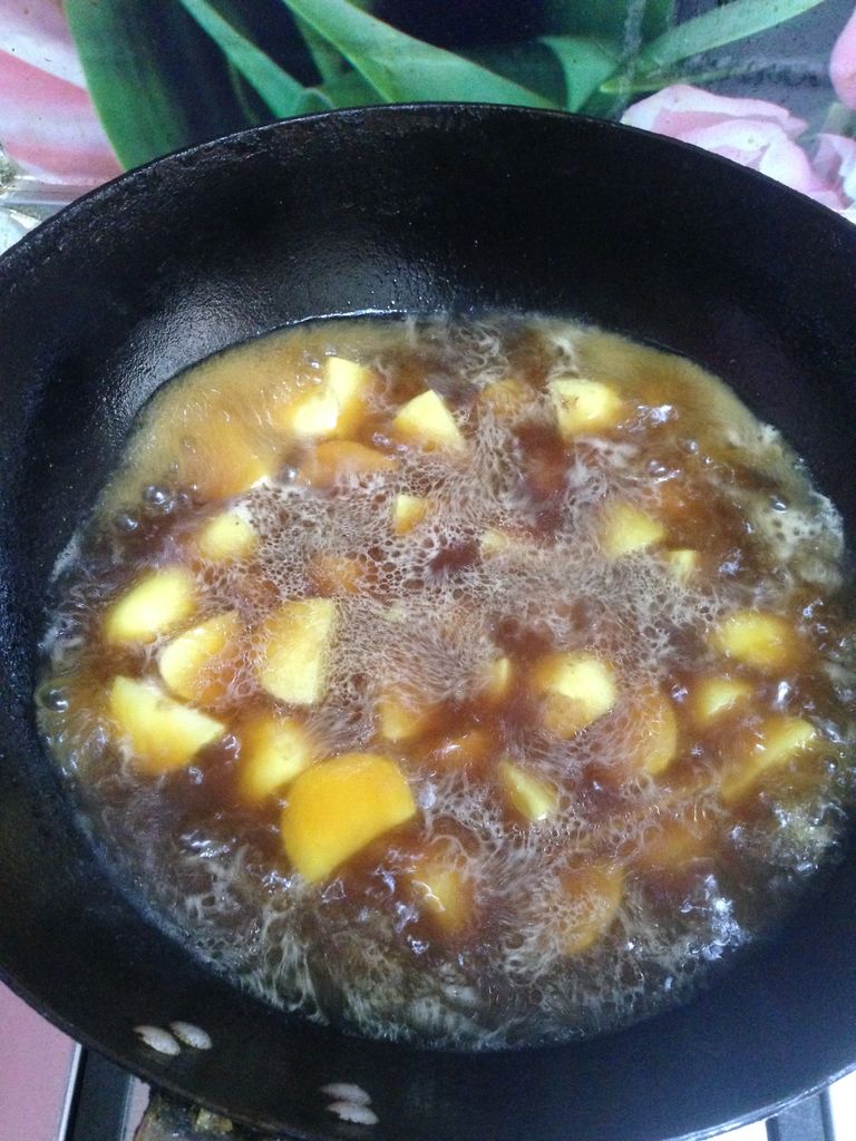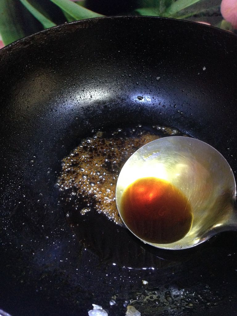4颜色由浅黄变成红亮的棕红色时,迅速倒入1勺的开水成糖色