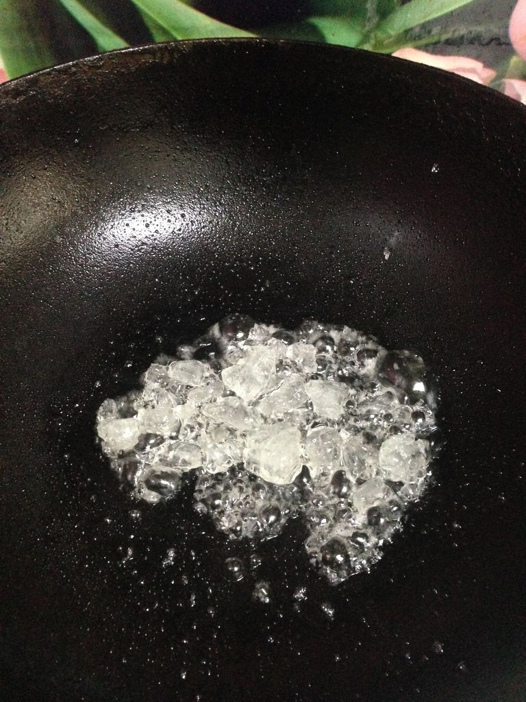 3 炒锅里放油,放入冰糖小火炒至慢慢融化