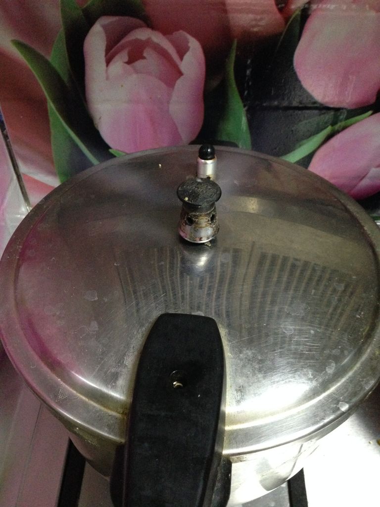 9 将炒锅里的肉块连同汤一起倒进高压锅里,加入料盒和一个干辣椒,用盐调味(如果颜色不够可以加一点老抽),加盖加阀,大火烧至上汽,转中小火8-10分钟,关火,自然泄气
