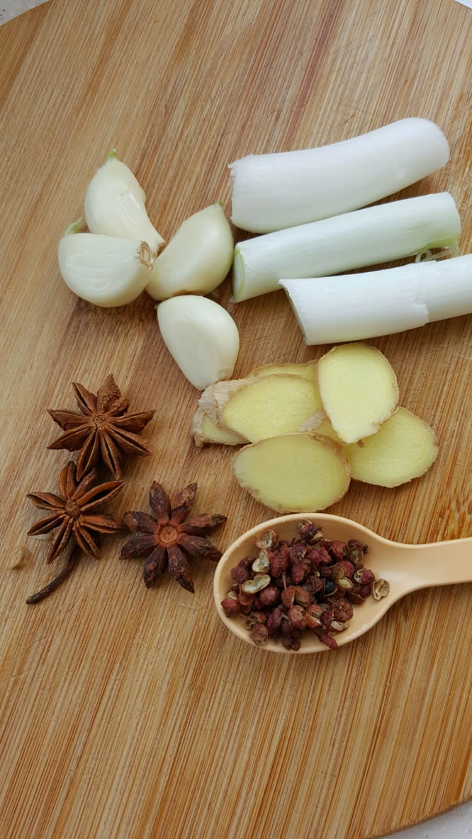4葱姜蒜八角花椒备用。蒜拍扁就行不用切。