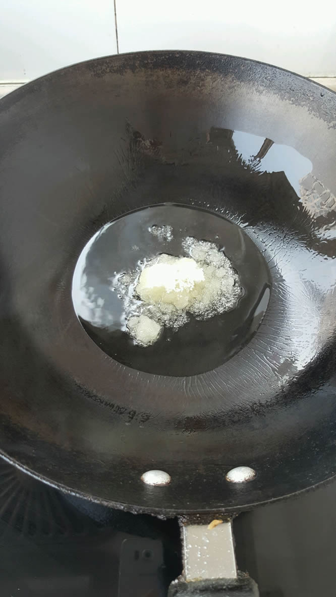 8这时放入葱姜蒜继续翻炒。闻到有香味时加水。