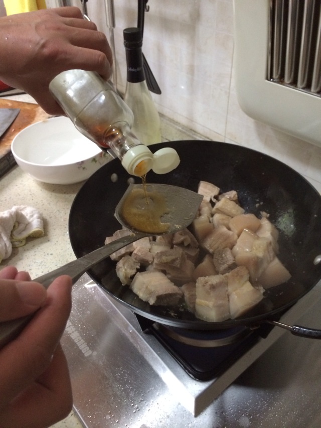 8加去爆好的肉翻炒 可加入少许老抽调色(量和料酒的差不多) 加盐调味 吃的甜的可以少加盐