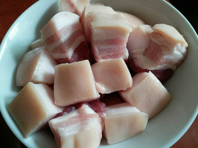 1五花肉洗净,控干水分,切成3厘米左右的方块(今天这块五花肉真是深得我心,肥而不腻,层次分明,我一定会把你们做好吃哒。)
