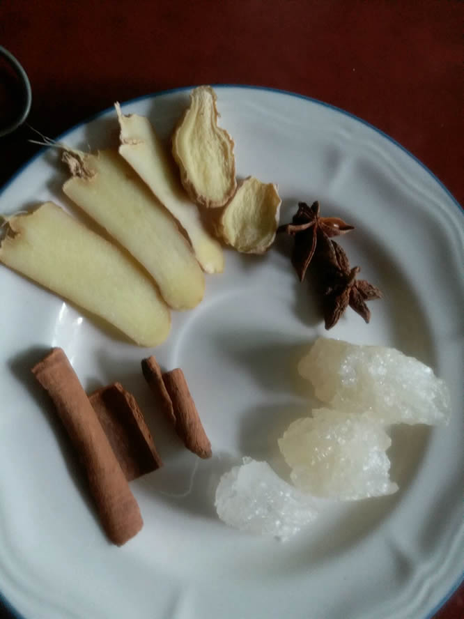 2准备好葱姜,桂皮,八角,冰糖,普洱茶